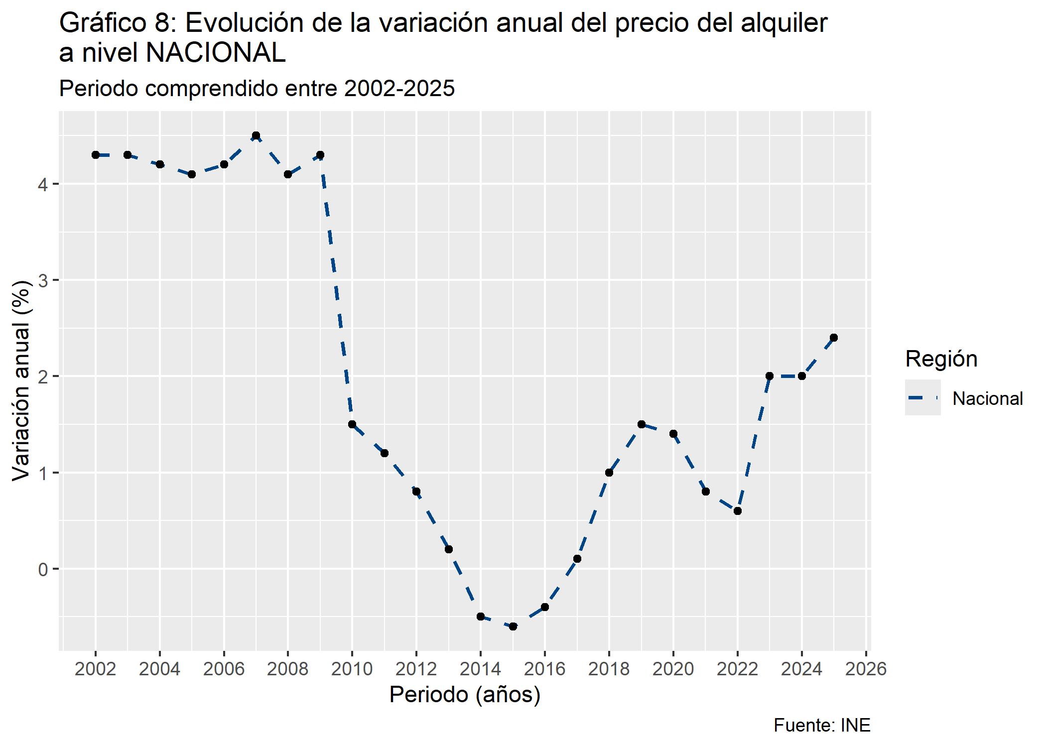 df_vivienda_nacional <- df_FINAL_VIVIENDA %>%filter(CCAA =="Nacional")p1 <-ggplot(df_vivienda_nacional, aes(x = Periodo_Fecha, y = var_anual_precio_alquiler)) +geom_line(aes(color ="Nacional"), linewidth =0.8, linetype ="dashed") +geom_point() +scale_color_manual(values =c("Nacional"="#004488")) +labs(title ="Gráfico 8: Evolución de la variación anual del precio del alquiler\na nivel NACIONAL",subtitle ="Periodo comprendido entre 2002-2025",caption ="Fuente: INE",x ="Periodo (años)",y ="Variación anual (%)",color ="Región") +scale_x_date(date_breaks ="2 year", date_labels ="%Y") p1
