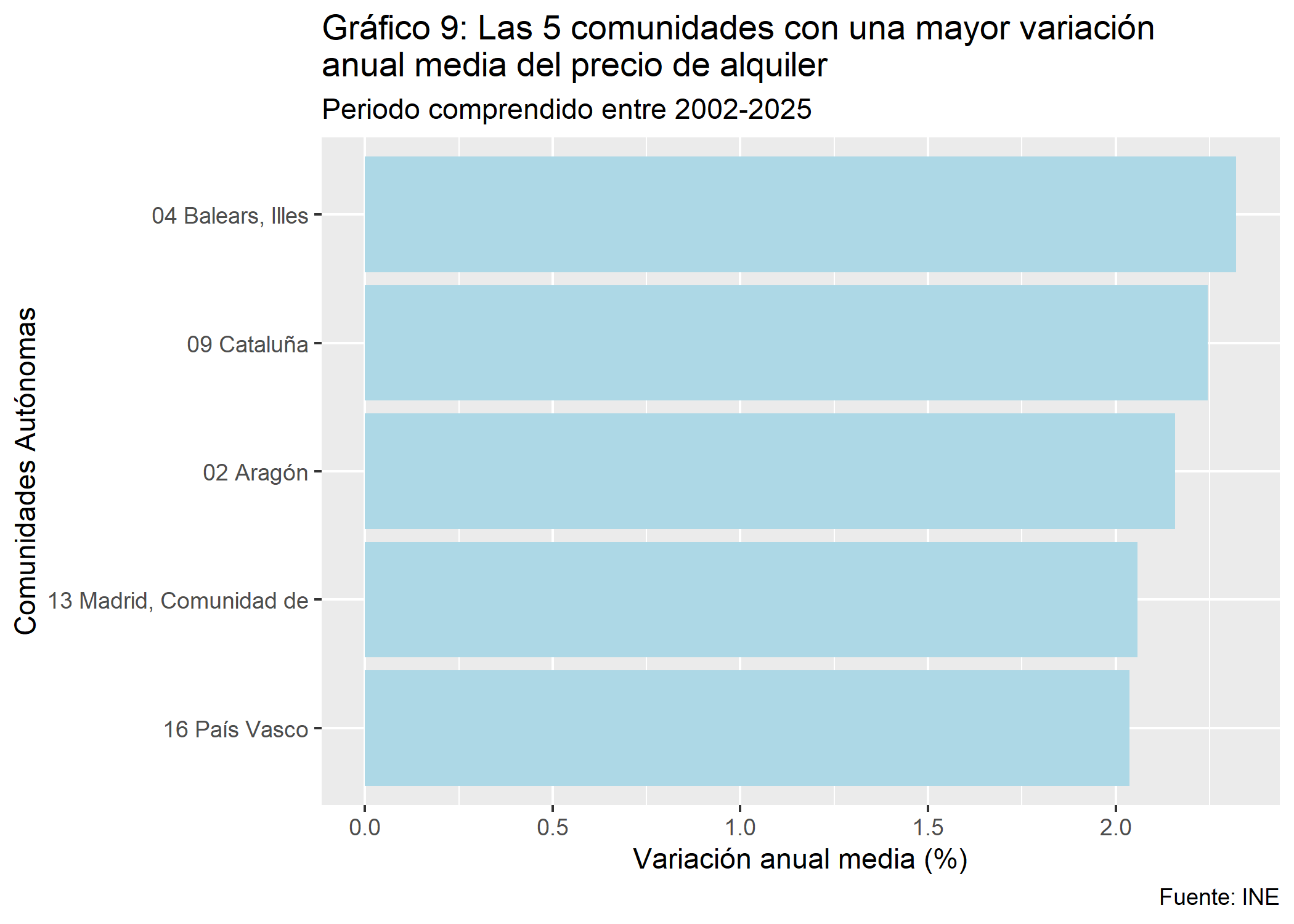 El Gráfico 9 identifica las 5 comunidades autónomas con la mayor variación anual media en el precio del alquiler durante el periodo 2002-2025. Liderando la lista se encuentran las Islas Baleares, seguidas muy de cerca por Cataluña, ambas con una variación media superior al 2.1%. Las comunidades de Aragón, Comunidad de Madrid y País Vasco cierran el top 5, manteniendo también variaciones medias anuales por encima del 2.0% para todo el período. Se muestra en un plot de barras con las coordenas invertidas y con el paquete forcats utilizamos la funcion fct_reorder para ordenar de mayor a menor