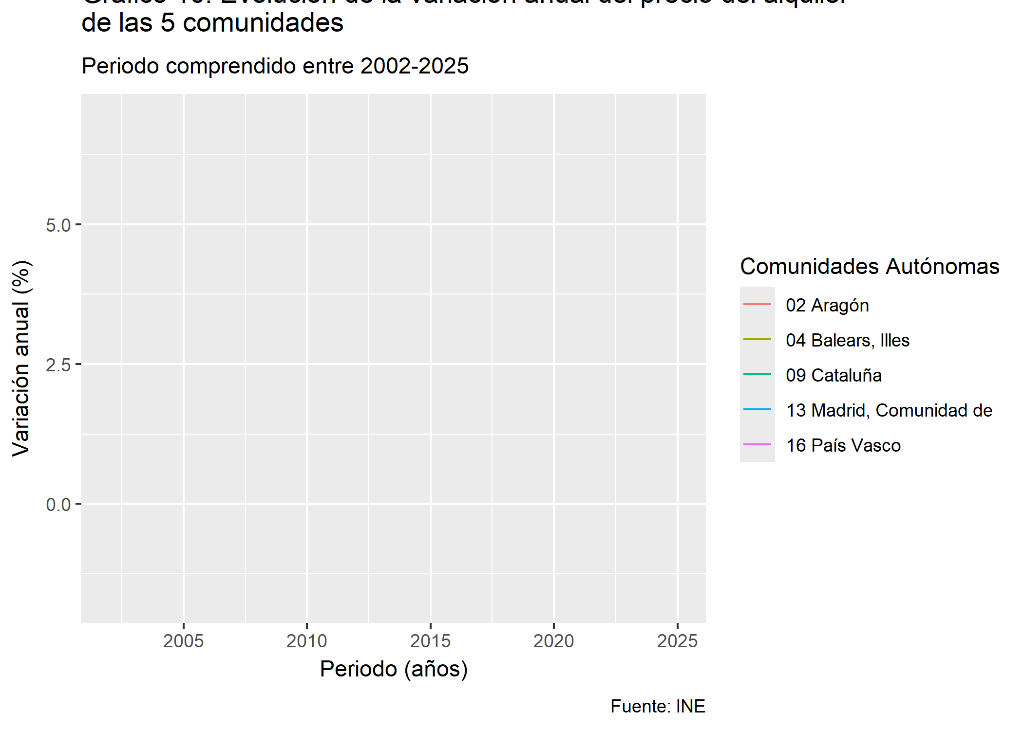 df_vivienda_maxs <- df_FINAL_VIVIENDA %>%filter(CCAA %in%c("04 Balears, Illes","09 Cataluña","02 Aragón","13 Madrid, Comunidad de","16 País Vasco"))p4 <-ggplot(df_vivienda_maxs, aes(x = Periodo_Fecha, y = var_anual_precio_alquiler, color = CCAA)) +geom_line() +labs(title ="Gráfico 10: Evolución de la variación anual del precio del alquiler\nde las 5 comunidades",subtitle ="Periodo comprendido entre 2002-2025",caption ="Fuente: INE",x ="Periodo (años)",y ="Variación anual (%)",color ="Comunidades Autónomas") grafico_ani_top5 <- p4 +transition_reveal(Periodo_Fecha) +enter_fade() +exit_fade()grafico_ani_top5