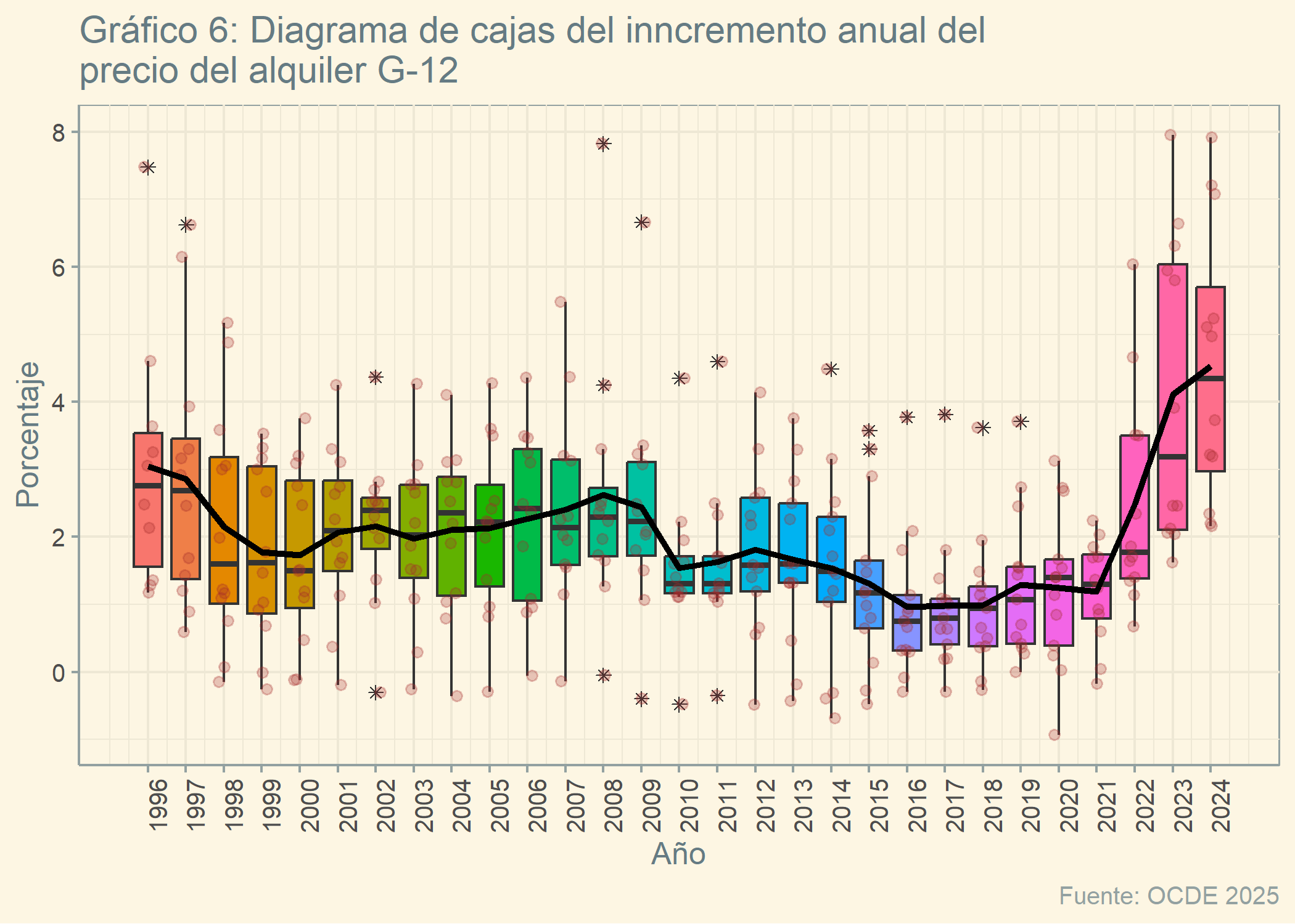 url_ocde <-"https://sdmx.oecd.org/public/rest/data/OECD.SDD.TPS,DSD_PRICES@DF_PRICES_ALL,1.0/CAN+AUS+BEL+FRA+DEU+ITA+JPN+NLD+ESP+CHE+SWE+GBR+USA+OECD+EU27_2020.A.N.CPI.PA.CP041.N.?startPeriod=1996&endPeriod=2024&dimensionAtObservation=AllDimensions&format=csvfilewithlabels"#Creamos el archivo y descargamos los datosdir.create("datos")ruta_ocde <-"./datos/alquileres_ocde_anual.csv"curl::curl_download(url_ocde, ruta_ocde) alquileres_ocde <-read_csv(ruta_ocde)#Filtramos los datosalquileres_ocde_anual <- alquileres_ocde %>%select(Measure, BASE_PER, EXPENDITURE, Expenditure, `Reference area`, TIME_PERIOD, OBS_VALUE) %>%mutate(año = TIME_PERIOD,values = OBS_VALUE, país =`Reference area`) #Creamos el gráficográfico <-ggplot(alquileres_ocde_anual, aes(x = año, y = values)) +geom_boxplot(aes(group = año, fill =as.factor(año)), outlier.shape =8) +geom_jitter(width =0.15, alpha =1/4, color ="brown") +labs(title ="Gráfico 6: Diagrama de cajas del inncremento anual del\nprecio del alquiler G-12", x ="Año", y ="Porcentaje",caption ="Fuente: OCDE 2025") +theme_solarized() +stat_summary(fun = mean, geom ="line", color ="black", size =1.2) +scale_x_continuous(breaks =seq(1996, 2024, by =1)) +theme(axis.text.x =element_text(angle =90),legend.position ="none")gráfico