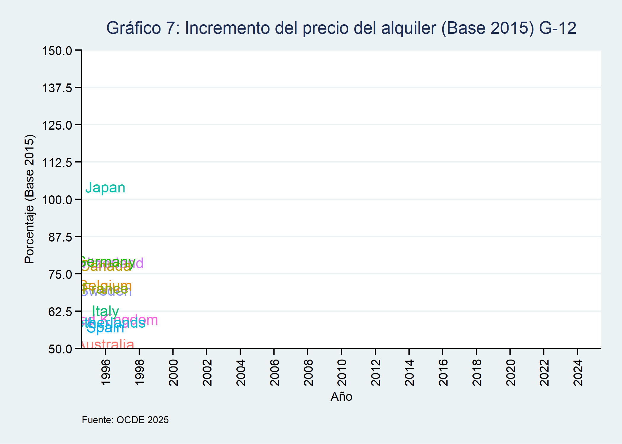 url_ocde <-"https://sdmx.oecd.org/public/rest/data/OECD.SDD.TPS,DSD_PRICES@DF_PRICES_ALL,1.0/CAN+AUS+BEL+FRA+DEU+ITA+JPN+NLD+ESP+CHE+SWE+GBR+USA+OECD+EU27_2020.A.N.CPI.IX.CP041.N.?startPeriod=1996&endPeriod=2024&dimensionAtObservation=AllDimensions&format=csvfilewithlabels"#Creamos el archivo y descargamos los datosdir.create("datos")ruta_ocde <-"./datos/alquileres_ocde.csv"curl::curl_download(url_ocde, ruta_ocde) alquileres_ocde <-read_csv(ruta_ocde)#Filtramos los datosalquileres_ocde <- alquileres_ocde %>%select(Measure, BASE_PER, EXPENDITURE, Expenditure, `Reference area`, TIME_PERIOD, OBS_VALUE) %>%mutate(año = TIME_PERIOD,values = OBS_VALUE, país =`Reference area`)#Creamos el gráfico gráfico <-ggplot(alquileres_ocde, aes(x = año, y = values, color = país)) +geom_line(size =1.4) +labs(title ="Gráfico 7: Incremento del precio del alquiler (Base 2015) G-12", x ="Año", y ="Porcentaje (Base 2015)",caption ="Fuente: OCDE 2025") +scale_x_continuous(breaks =seq(1996, 2024, by =2)) +scale_y_continuous(breaks =seq(50, 150, by =12.5),limits =c(50, 150),expand =c(0, 0)) +theme_stata() +theme(legend.position ="none",axis.text.x =element_text(angle =90, vjust =0.5),axis.text.y =element_text(angle =0)) +geom_text(aes(label = país))#Animámos el gráficográfico_animado <- gráfico +transition_reveal(año)+enter_fade() +exit_fade()gráfico_animado