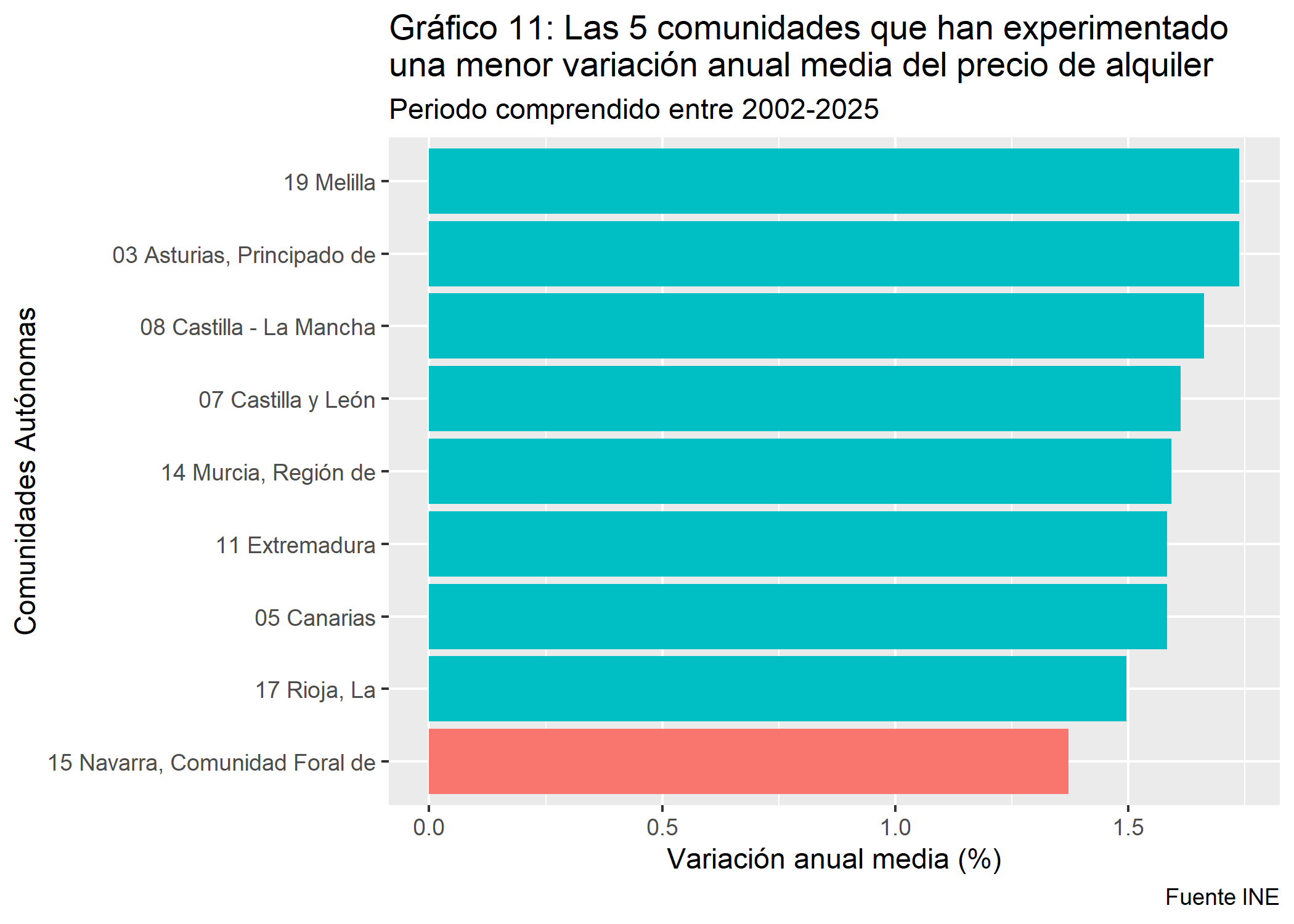 df_vivienda_promedios_mins <- df_FINAL_VIVIENDA %>%group_by(CCAA) %>%summarise(media_var_anual =mean(var_anual_precio_alquiler))%>%ungroup() %>%slice_min(media_var_anual, n =8)p3 <-ggplot(df_vivienda_promedios_mins, aes(x = forcats::fct_reorder(CCAA, media_var_anual), y = media_var_anual, fill =ifelse (CCAA =="15 Navarra, Comunidad Foral de", "darkred", "lightblue"))) +geom_col() +coord_flip() +labs(title ="Gráfico 11: Las 5 comunidades que han experimentado\nuna menor variación anual media del precio de alquiler",subtitle ="Periodo comprendido entre 2002-2025",caption ="Fuente INE",x ="Comunidades Autónomas",y ="Variación anual media (%)") +theme(legend.position ="none")p3