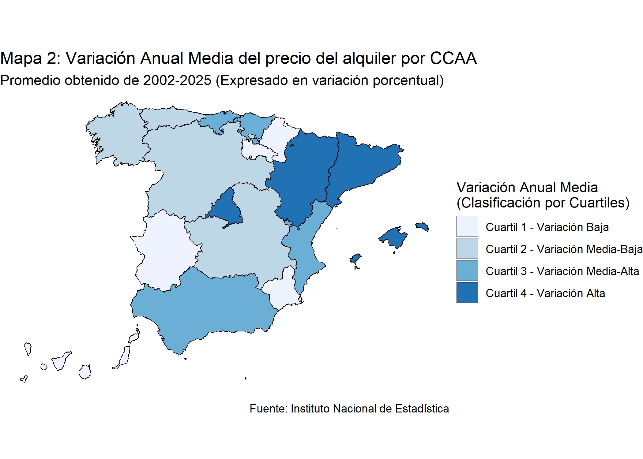 En el Mapa 2 se observa la variación media anual del alquiler (2002-2025), muestra una fuerte dualidad territorial en España. Las subidas más altas (Cuartil 4) se concentran de forma clara en el Mediterráneo, lideradas por Cataluña y las Islas Baleares. La Comunidad de Madrid y la Comunidad Valenciana se sitúan en el cuartil de variación media-alta (Cuartil 3). En contraste, las regiones de la mitad oeste (Galicia, Extremadura, Castilla y León) presentan la variación más baja (Cuartil 1). El patrón subraya una mayor presión de la demanda en zonas costeras y en los principales centros económicos del país.