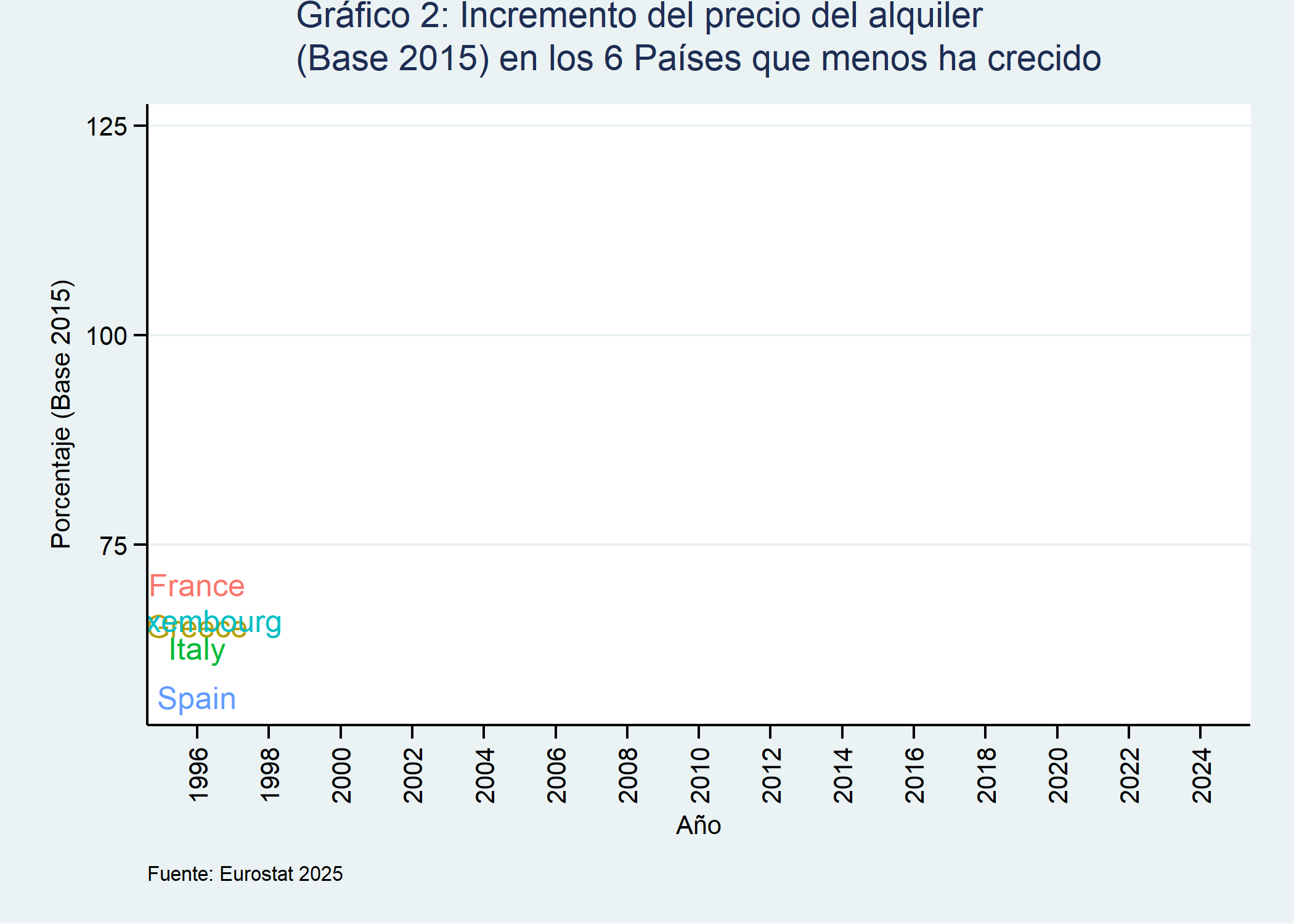 #Gráfico del nontopnontop_paises <- df_alquileres_nontop_6_2024$paisesdf_nontop <- df_alquileres_index %>%filter(unit =="Annual average index", paises %in% nontop_paises)grafico_nontop <-ggplot(df_nontop, aes(x = año, y = values, color = paises)) +geom_line(size =1.4) +labs(title ="Gráfico 2: Incremento del precio del alquiler\n(Base 2015) en los 6 Países que menos ha crecido", x ="Año", y ="Porcentaje (Base 2015)",caption ="Fuente: Eurostat 2025") +scale_x_continuous(breaks =seq(1996, 2024, by =2)) +scale_y_continuous(breaks =seq(0, 200, by =25)) +theme_stata() +theme(legend.position ="none", axis.text.y =element_text(angle =0),axis.text.x =element_text(angle =90, vjust =0.5)) +geom_text(aes(label = paises))grafico_nontop_animado <- grafico_nontop +transition_reveal(año) animate(grafico_nontop_animado, renderer =gifski_renderer())