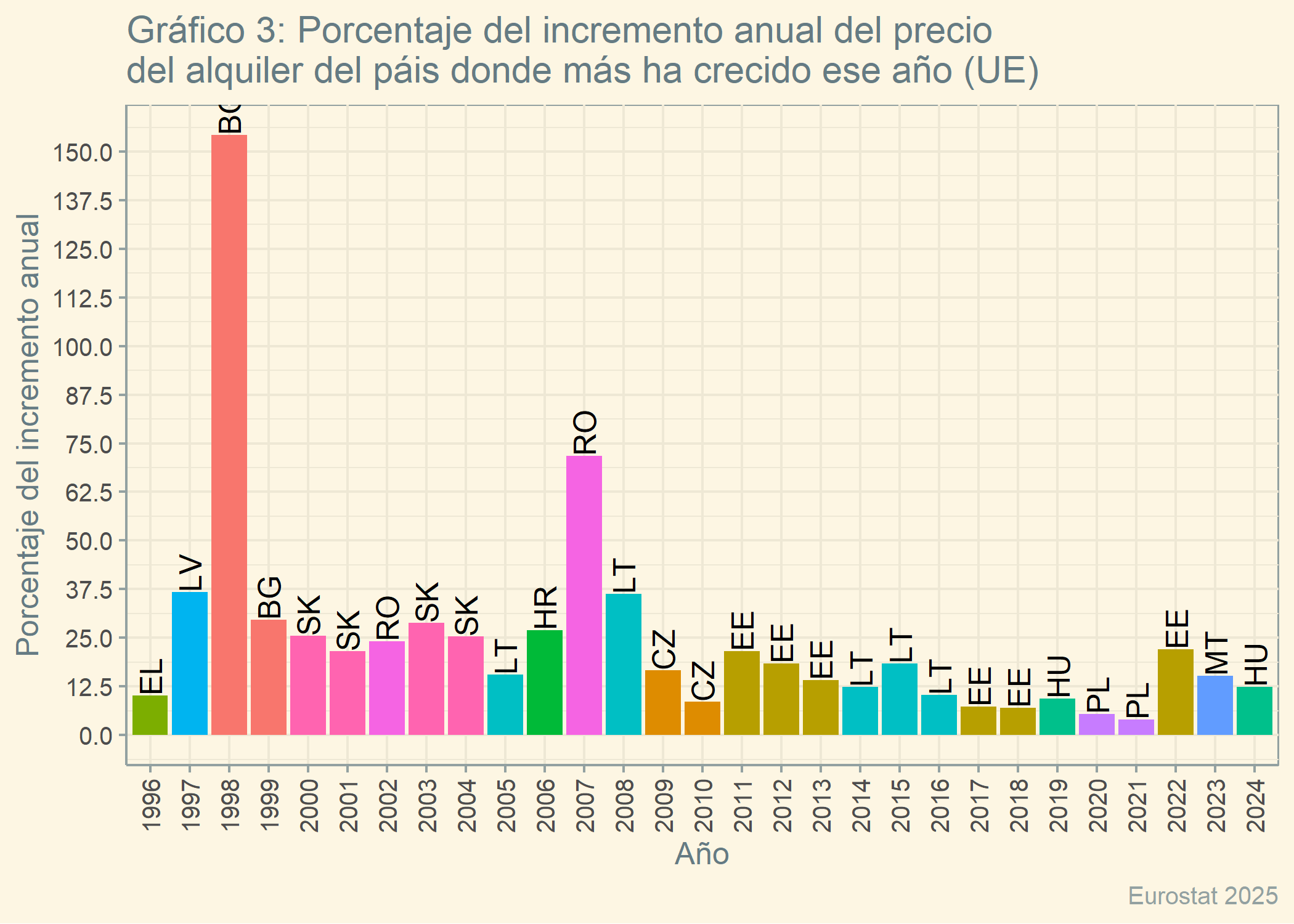 my_table <-"prc_hicp_aind"eurostat::label_eurostat_tables(my_table)#> [1] "HICP - annual data (average index and rate of change)"df <- eurostat::get_eurostat(my_table, time_format ="raw") df_alquileres_anual <- df %>%filter(coicop =="CP041", unit =="RCH_A_AVG",!geo %in%c("EU27_2020", "EA19", "EU28", "EA", "EA20","EA19", "US", "XK", "TR", "RS", "AL", "MK", "ME", "UK", "EEA", "EU")) %>% dplyr::rename(país = geo, año = TIME_PERIOD) %>%select(-freq) #TOP (Porcentaje del incremento anual del precio del alquiler del páis donde más ha crecido ese año)df_top <- df_alquileres_anual %>%group_by(año) %>%slice_max(order_by = values, n =1) %>%ungroup() %>%arrange(año)gráfico_barras_TOP <-ggplot(df_top, aes(x = año, y = values, fill = país)) +geom_col() +labs(title ="Gráfico 3: Porcentaje del incremento anual del precio\ndel alquiler del páis donde más ha crecido ese año (UE)",x ="Año", y ="Porcentaje del incremento anual",caption ="Eurostat 2025") +theme_solarized() +geom_text(aes(label = país), angle =90, hjust =0) +scale_y_continuous(breaks =seq(0, 170, by =12.5)) +theme(axis.text.x =element_text(angle =90, vjust =0.5),legend.position ="none")gráfico_barras_TOP