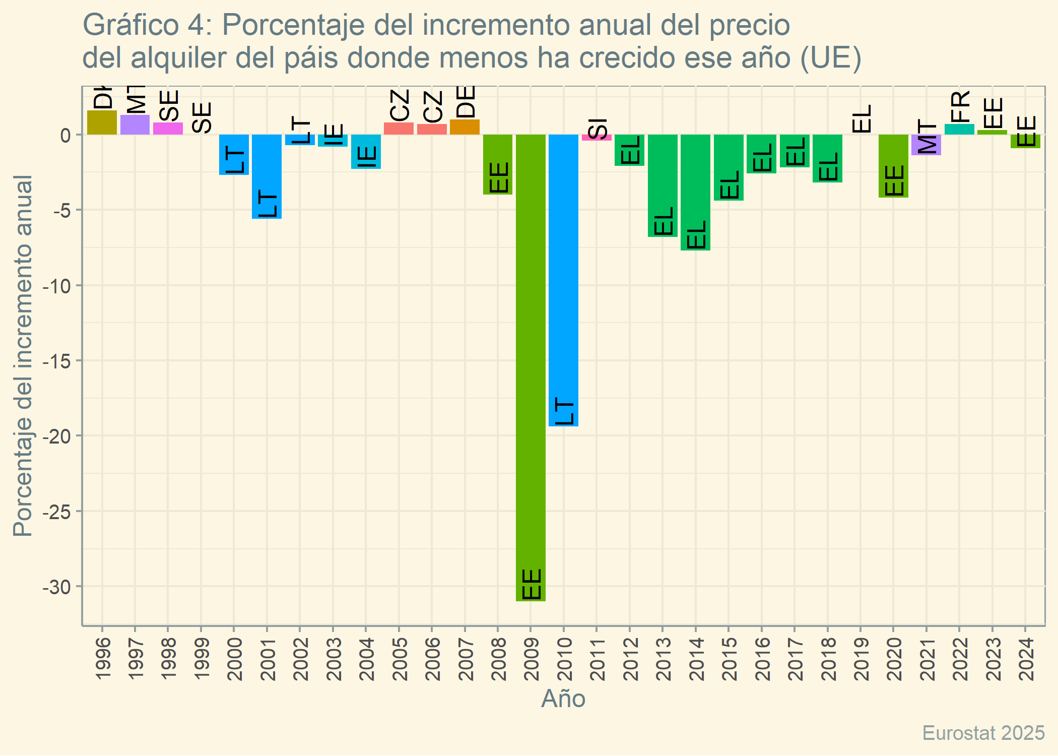 #NONTOPdf_nontop <- df_alquileres_anual %>%group_by(año) %>%slice_min(order_by = values, n =1) %>%ungroup() %>%arrange(año)gráfico_barras_NONTOP <-ggplot(df_nontop, aes(x = año, y = values, fill = país)) +geom_col() +labs(title ="Gráfico 4: Porcentaje del incremento anual del precio\ndel alquiler del páis donde menos ha crecido ese año (UE)",x ="Año", y ="Porcentaje del incremento anual",caption ="Eurostat 2025") +theme_solarized() +geom_text(aes(label = país), angle =90, hjust =0) +scale_y_continuous(breaks =seq(-40, 10, by =5)) +theme(axis.text.x =element_text(angle =90, vjust =0.5),legend.position ="none")gráfico_barras_NONTOP