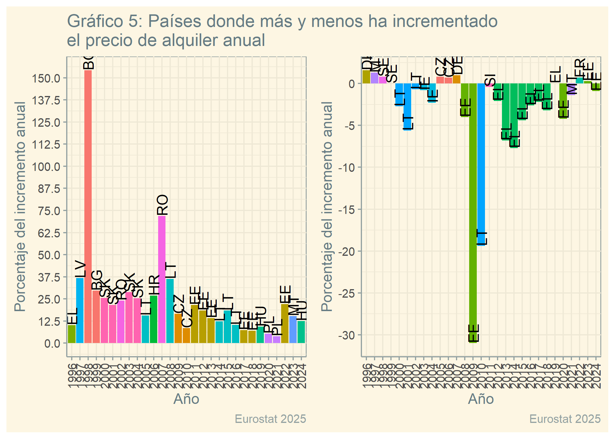 library(patchwork) #- utiliza el pkg "patchwork" para mostrar los 2 gráficos (p1 y p2) side-by-sidegráfico_barras_TOP_v2 <-ggplot(df_top, aes(x = año, y = values, fill = país)) +geom_col() +labs(x ="Año", y ="Porcentaje del incremento anual",caption ="Eurostat 2025") +theme_solarized() +geom_text(aes(label = país), angle =90, hjust =0) +scale_y_continuous(breaks =seq(0, 170, by =12.5)) +theme(axis.text.x =element_text(angle =90, vjust =0.5),legend.position ="none")gráfico_barras_NONTOP_v2 <-ggplot(df_nontop, aes(x = año, y = values, fill = país)) +geom_col() +labs(x ="Año", y ="Porcentaje del incremento anual",caption ="Eurostat 2025") +theme_solarized() +geom_text(aes(label = país), angle =90, hjust =0) +scale_y_continuous(breaks =seq(-40, 10, by =5)) +theme(axis.text.x =element_text(angle =90, vjust =0.5),legend.position ="none")gráfico_barras_TOP_v2 +labs(title ="Gráfico 5: Países donde más y menos ha incrementado\nel precio de alquiler anual") + gráfico_barras_NONTOP_v2