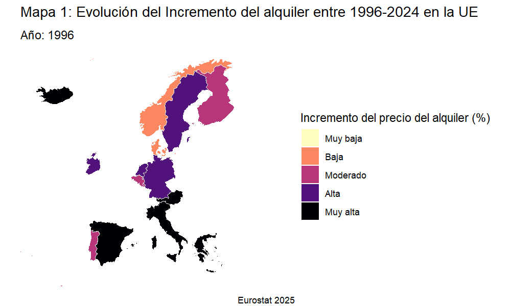 my_table <-"prc_hicp_aind"eurostat::label_eurostat_tables(my_table)#> [1] "HICP - annual data (average index and rate of change)"df <- eurostat::get_eurostat(my_table, time_format ="raw") df_alquileres_anual <- df %>%filter(coicop =="CP041", unit =="RCH_A_AVG",!geo %in%c("EU27_2020", "EA19", "EU28", "EA", "EA20","EA19", "US", "XK", "TR", "RS", "AL", "MK", "ME", "UK", "EEA", "EU")) %>%rename(país = geo, año = TIME_PERIOD) %>%select(-freq) %>%mutate(año =as.numeric(año))mapa_europa <-gisco_get_nuts(year ="2021", resolution ="20", nuts_level =0) %>%rename(país = NUTS_ID)mapa_animado_data <- mapa_europa %>%inner_join(df_alquileres_anual, by ="país") %>%mutate(incremento_alquileres_grupos =factor(ntile(values, 5),labels =c("Muy baja", "Baja", "Moderado","Alta", "Muy alta")))animacion <-ggplot(mapa_animado_data) +geom_sf(aes(fill = incremento_alquileres_grupos), color ="white", size =0.1) +scale_fill_viridis_d(option ="magma", direction =-1, name ="Incremento del precio del alquiler (%)") +theme_void() +coord_sf(xlim =c(-25, 45), ylim =c(34, 72)) +labs(title ="Mapa 1: Evolución del Incremento del alquiler entre 1996-2024 en la UE",subtitle ="Año: {current_frame}",caption ="Eurostat 2025") +transition_manual(año) +ease_aes("linear") animate(animacion, renderer =gifski_renderer(), duration =35, fps =25, width =1000,height =600,units ="px",res =150)